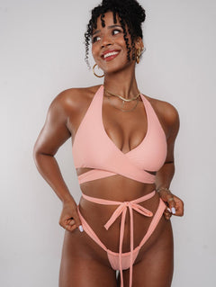 Naomi – how can a bandeau bikini top have so much variety and be so timeless at the same time? Starting with a classic bandeau shape, the ruching detail at the front gives you the option to a) wear it strapless and tie a bow underneath, b) pull the strap around the neck and still have a tie front detail, c) turn it around and create a tie halter neckline &&&... With our NAOMI top you get minimal tan lines and still have the option to create an extra hold for potential activities. The golden tips add an extra glamour to the functional top, which for sure comes with removable cups.