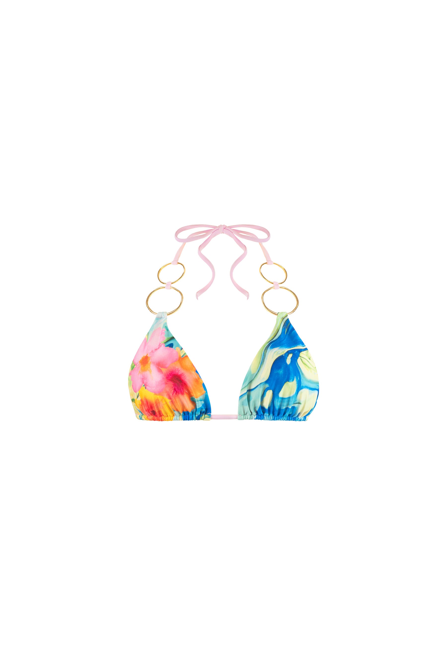 A watercolor dream of hibiscus blossoms and ocean blues. Like diving into warm, crystal-clear water under a glowing sky. You’re not making waves; you’re making a full-on statement with this bikini. Crafted with finesse, the MUSE top features large, golden, purposely uneven statement rings - secret weapons for turning heads on the beach and beyond. Fully adjustable through neck and back ties, this top comes with removable padding for a customizable fit.
